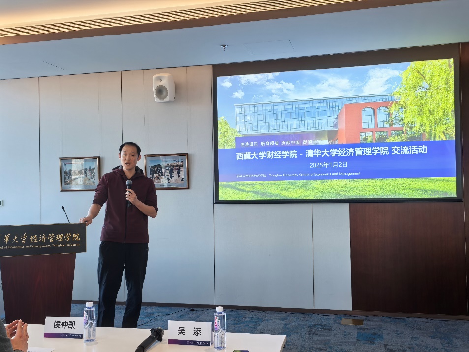 学院党委研究生工作组组长吴添首先对西藏大学财经学院到访师生致以热烈欢迎。他回顾了清华经管学院与西藏自治区的合作,介绍了学院师生前往墨脱等边疆地区开展志愿公益实践的情况,并期待双方以本次座谈会为起点,未来在其他领域进一步深化合作。