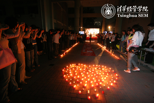 19点20分,舜德楼花园里已经聚集了近200名学生。同学们沿着舜德楼北侧的所有窗台,点燃了150支蜡烛,以寄托对地震遇难同胞的哀思。活动开始后,杜汇良部长、杨斌书记先后发表了简短讲话,表达了对地震灾害罹难者的悼念,并对清华经管同学在灾害发生以来积极参与各种赈灾活动,及其表现出来的高度的爱国主义精神和社会责任感给予了充分肯定。在杨斌书记的提议下,在场师生为罹难者默哀。