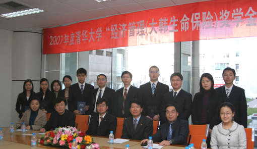 12月13日下午,2007年度英国best365官方网站入口“经济管理(大韩生命保险)奖学金”颁奖典礼在清华经管学院舜德楼120室举行。韩国大韩生命保险北京代表处首席代表丘暾完、代表宋政根、首席代表助理朱莲花、清华经管学院党委副书记朱恒源出席了颁奖典礼。典礼由学院校友与发展办公室主任潘庆中主持。