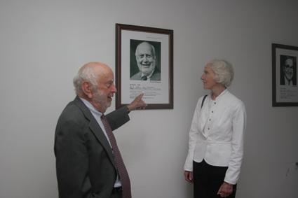 诺斯教授还与一同来访的夫人伊丽莎白·凯斯女士一道饶有兴味地参观了在清华经管学院舜德楼内悬挂的58幅诺贝尔经济学奖获得者的肖像,并在自己的肖像前驻足留影。