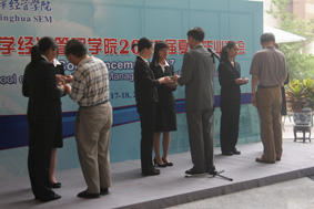 中午时分,所有的本科毕业生和他们的家长们受邀参加了在学院舜德楼大厅举行的本科生毕业酒会。钱颖一院长在致辞中首先表达了对毕业生的祝贺,并回忆了四年来与同学们一起所经历的光荣与梦想,成功与挫折。最后,钱院长鼓励即将走出校门,重新启航的同学们牢记朱镕基老院长的嘱托:“珍惜在清华的学习时刻”,“自强不息,厚德载物,必有大用于民族、国家。”毕业生还与领导、老师们一同参加了本科毕业生的保留节目——“十年封条”仪式,他们用自己的方式表达了对母校和学院的感激、留恋和祝福。酒会气氛轻松欢快,也略带些许伤感。
